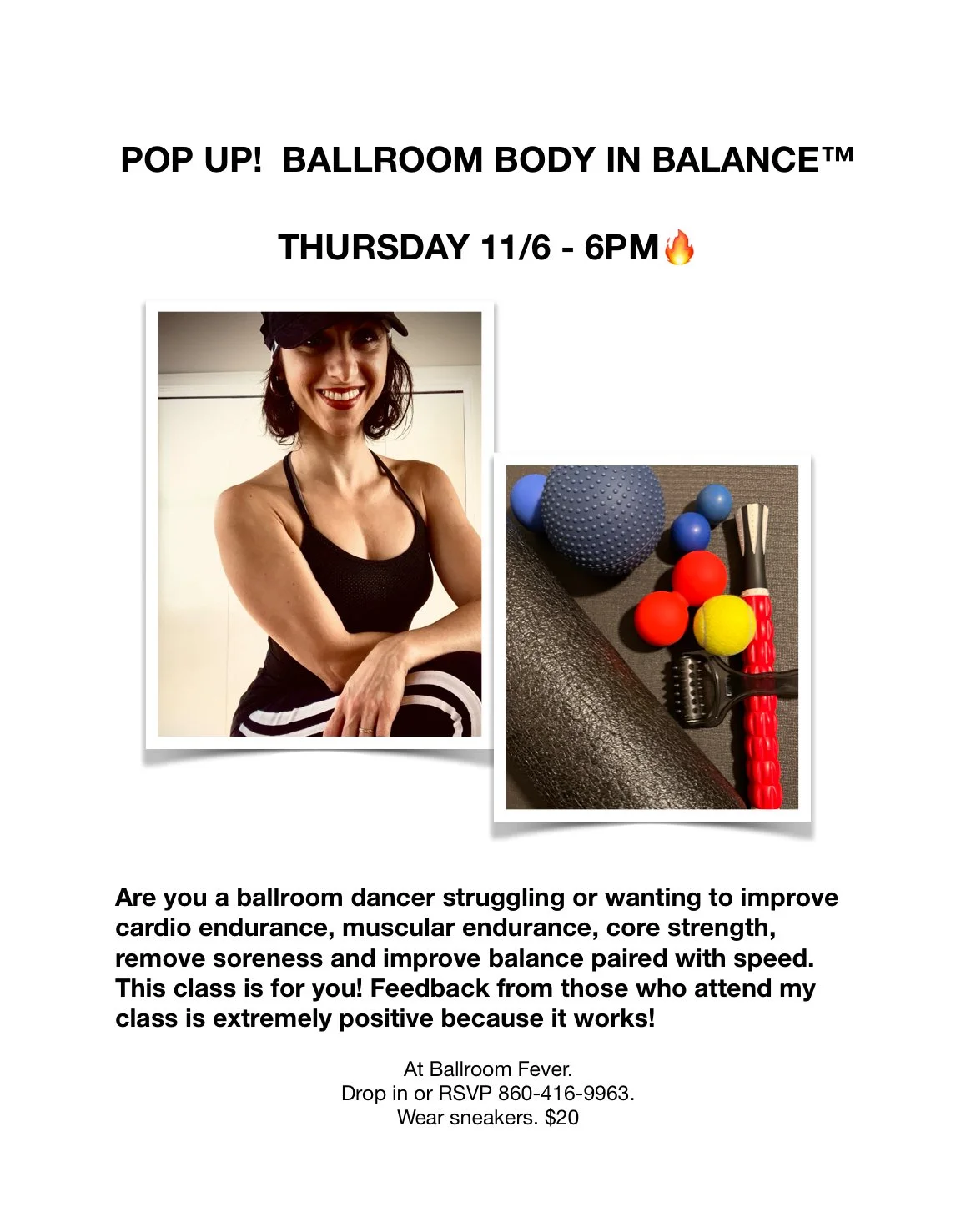 The Ballroom Body™ is a conditioning program designed by CK Movement, LLC in 2019 in correlation with Body IN Balance™ designed dancers to improve balance, core, cardio endurance, muscle tone & muscular endurance for optimum performance and overall fitness. Training is derived from dance conditioning as well as science based training methods. CK Movement, LLC trainer and pro dancer, Christine Kjellquist is the creator of this program. Not a dancer? But want to look and move like one? Come join us!